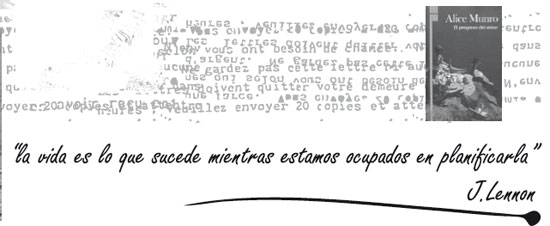 Para disfrutar de la lectura de Alice Munro, debemos tener presente a Lennon. Si esperamos sólo el desenlace de cualquiera de sus cuentos, apurando su lectura, nos perderemos todo lo que sucede alrededor de la trama. Y eso es lo delicioso de su lectura. Los personajes de Munro tienen una vida de relación, no sólo con otras personas sino con el entorno que los rodea. Y es precisamente ese entorno que los moldea lo que da valor y belleza a esos relatos que le valieron el Nobel de Literatura 2013.