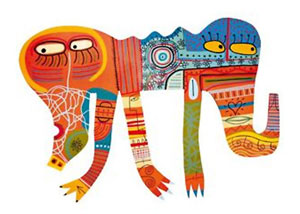 Se destacan figuras de tipo naif, de intensos colores destacan las actitudes de los seres. De lenguaje sencillo que aporta con palabras simples impresas en algunas obras.